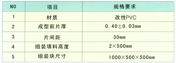 雙向波淋水填料,其片形由正弦波和梯形波分段錯(cuò)位的直波組成,提高了氣水的擾流和下泄速度減緩,提高了填料的散熱特性,由于增大了通孔面積,保持膠球的暢通,提高防泥垢堵塞的能力,其熱力、特性和阻力特性與引進(jìn)的復(fù)合波相當(dāng),冷卻效果較好。